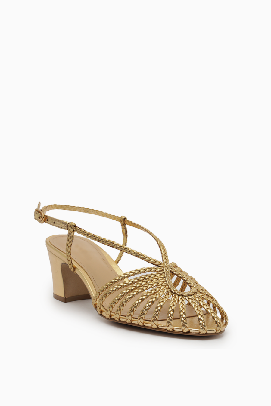 סנדל בעיטור צמות עור, עקב נמוך , נוח מאד ועוטף את אצבעות הרגל ,